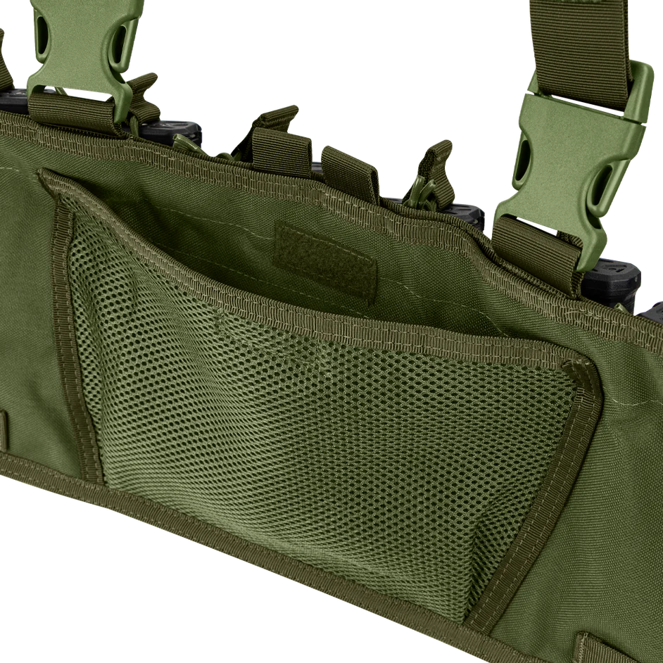 Designed with comfort and mobility in mind, the rig features padded cross-back shoulder straps with integrated webbing and D-rings for attaching additional gear. Its lightweight construction prioritizes speed and ease of movement while maintaining a secure, stable fit. An internal mesh pocket and four elastic loops provide extra storage for essential accessories.